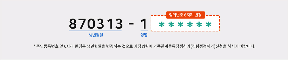 앞서 설명드렸듯이 주민등록번호의 변경은 생년월일과 성별을 제외한 뒤의 6자리 숫자를 변경해주는 것입니다.